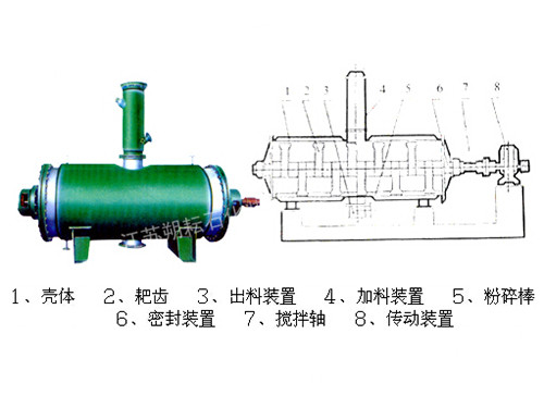 被干燥物料從殼體上方正中間加入,在不斷正反轉動的耙齒的攪拌下,物料軸向來回走動,與殼體內壁接觸的表面不斷換新,受到蒸汽的間接加熱,耙齒的均勻攪拌,粉碎棒的粉碎,使物料內的水份氣化,在真空系統的作用下,使被干燥物料內部水份和表面水份有利的排出,氣化的水份經干式除塵器、濕式除塵器、冷凝器,從真空泵出口處放空。